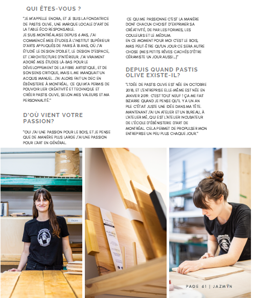 « Jamais l’art de la table n’aura été aussi écoresponsable et personnalisé. Sous-verres, plateaux de fromages ou encore planchettes pour l’apéritif; les créations design d’Énora Billard découle de son amour d’inviter des amis autour d’une table conviviale. Bois, teintures et matériaux naturels sont à l’honneur avec Pastis Olive. »