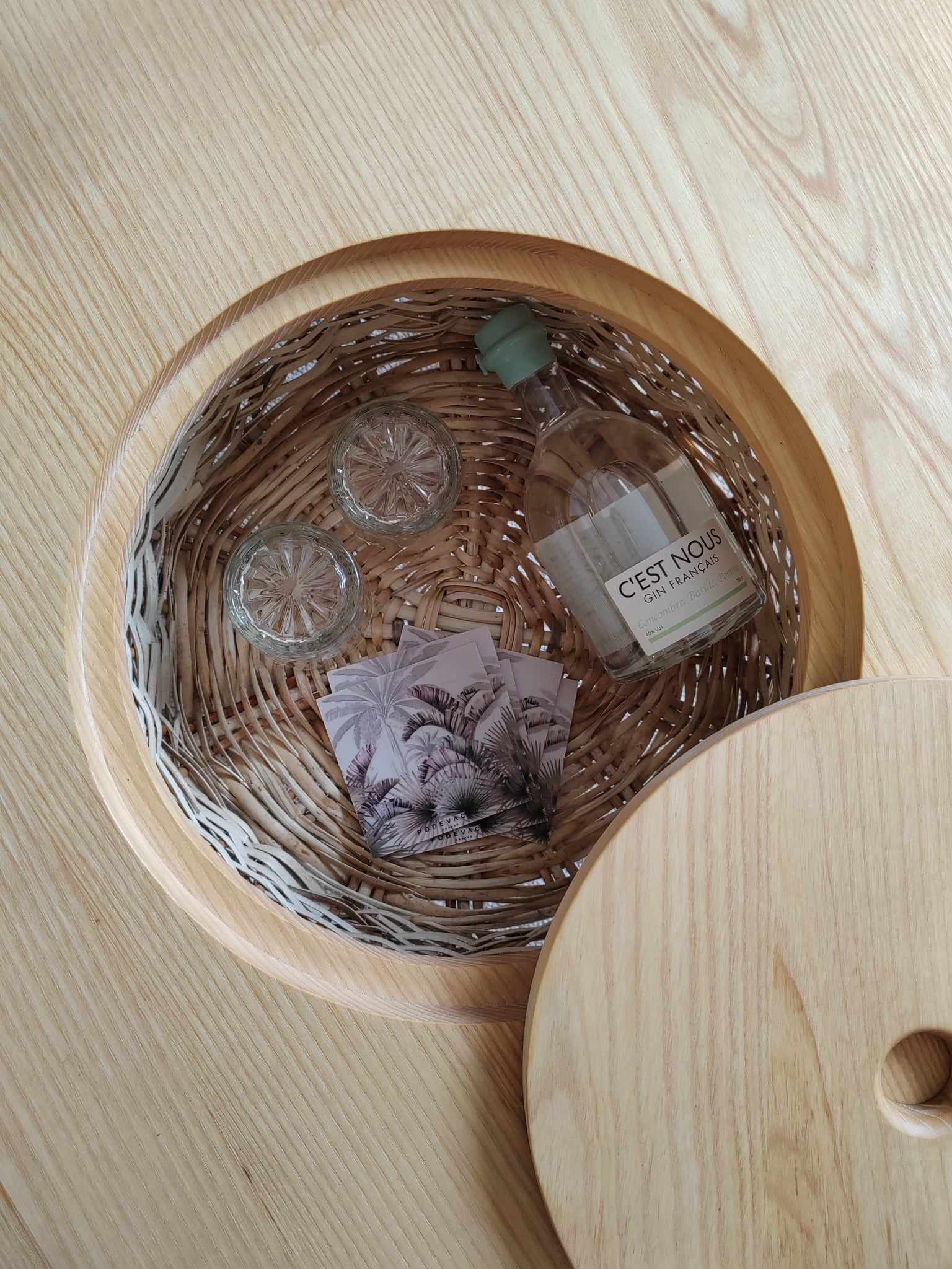 Inspirée par l’idée de combiner beauté et praticité, cette table offre une solution élégante pour organiser votre espace tout en restant conviviale. Son panier en noisetier accueille facilement vos essentiels de salon : livres, sous-verres, plantes, ou même une bouteille de champagne pour les moments festifs.Caractéristiques principales :