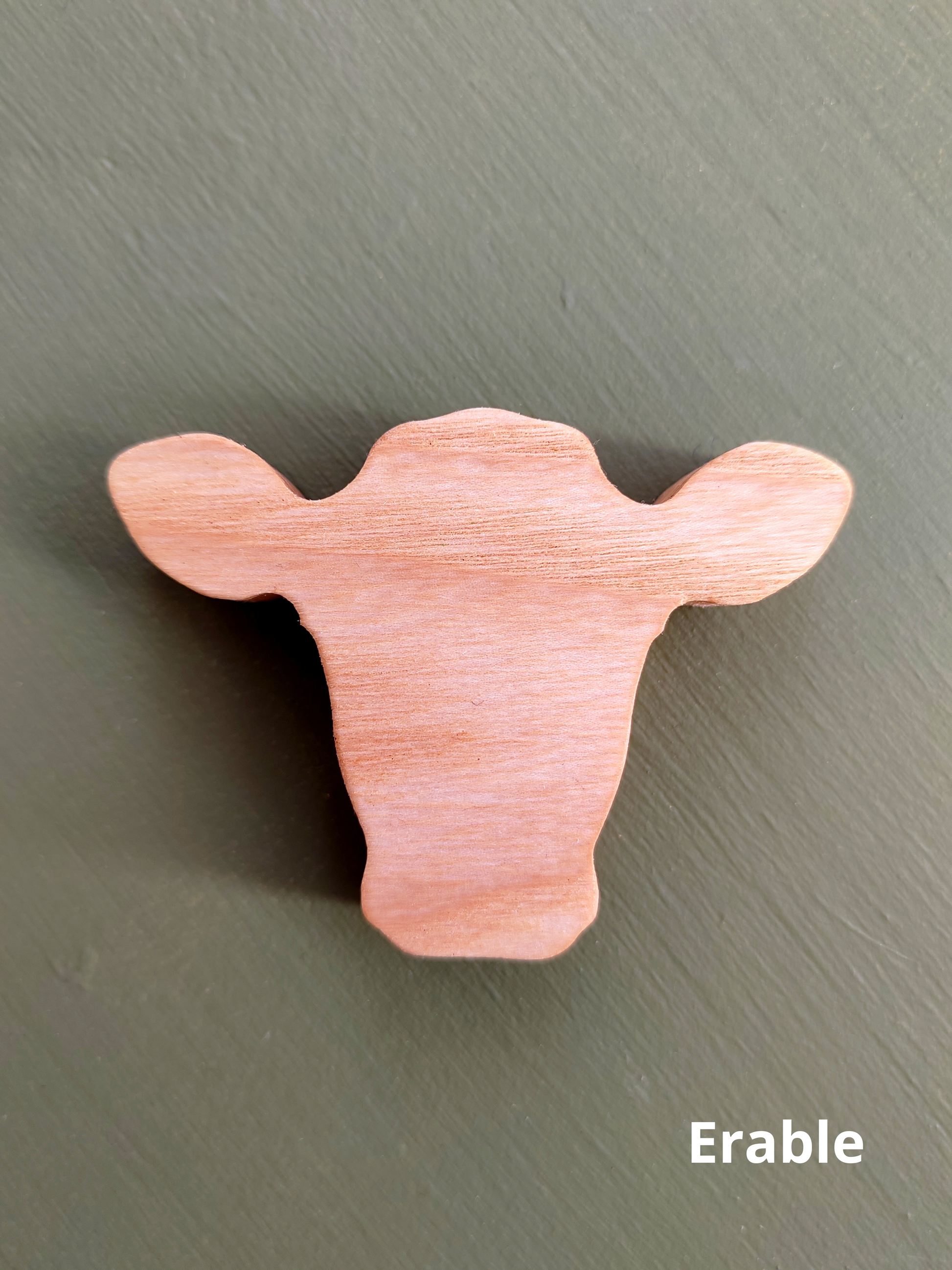 Ces magnets en forme de tête de vache sont fabriqués dans notre atelier à Pennedepie, à partir de bois massif local : érable, frêne et cerisier