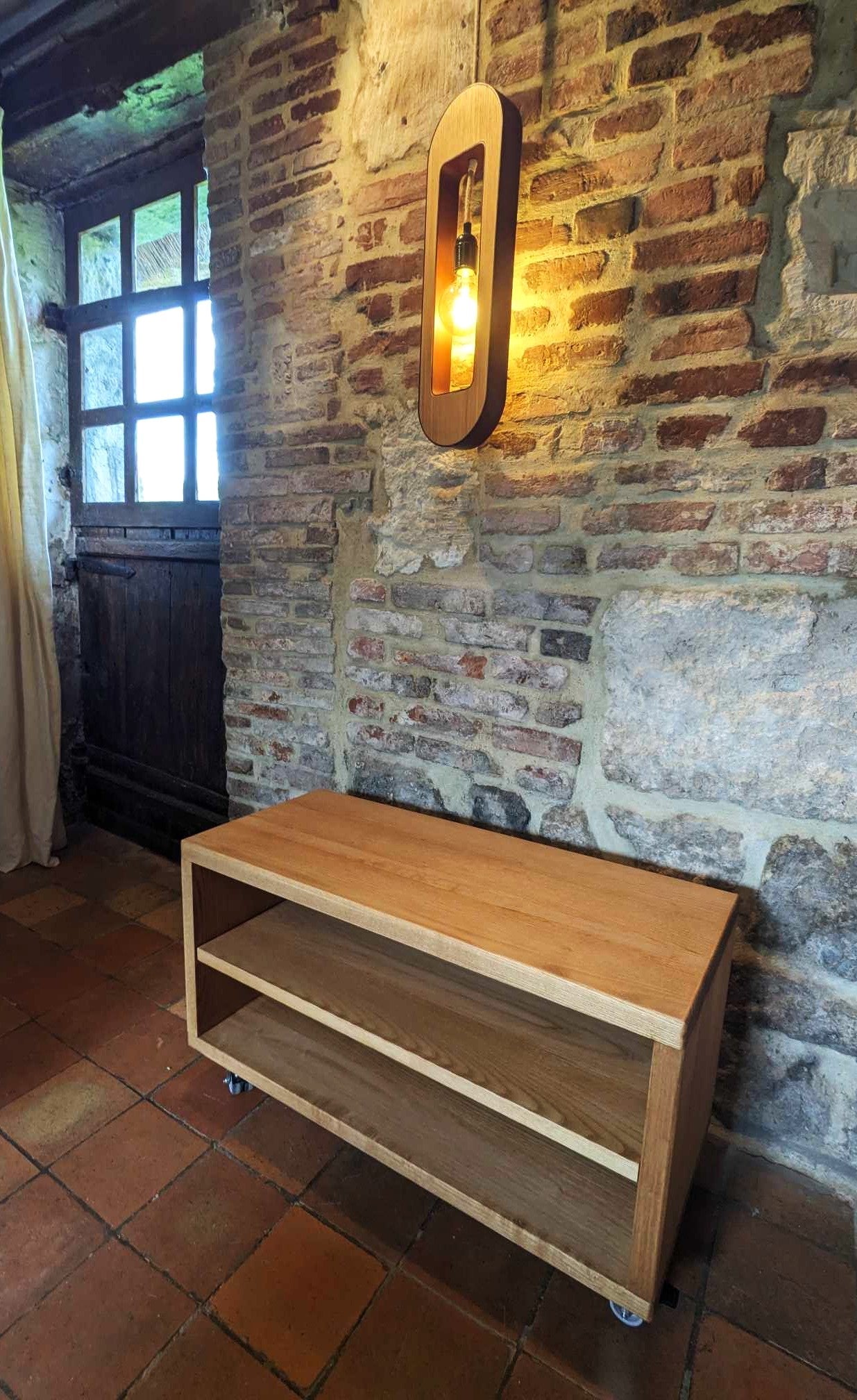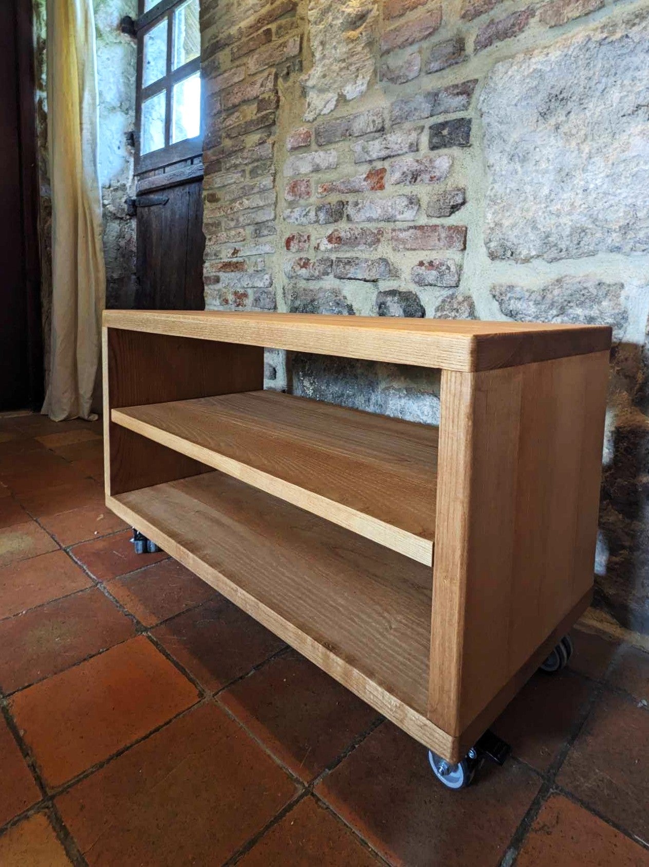 Meuble TV en frêne à roulette avec étagère au milieu. Fabriqué dans notre atelier en Normandie.